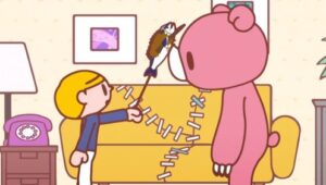 Gloomy, an abandoned little bear, is rescued by Pitty (the little boy). At first, he is cute and cuddly, but becomes wilder as he grows up. Since bears do not become attached to people like dogs by nature, Gloomy attacks Pitty even though he is the owner. So Gloomy has blood on him from biting and/or scratching Pitty.